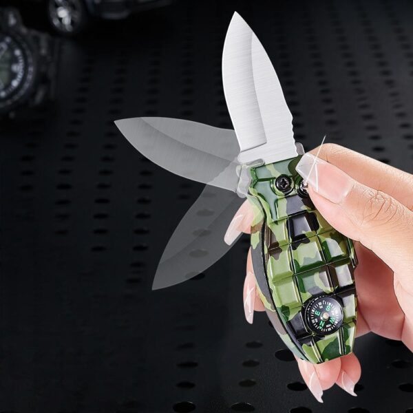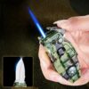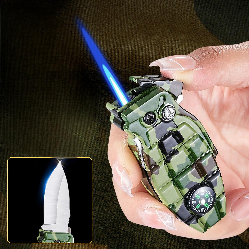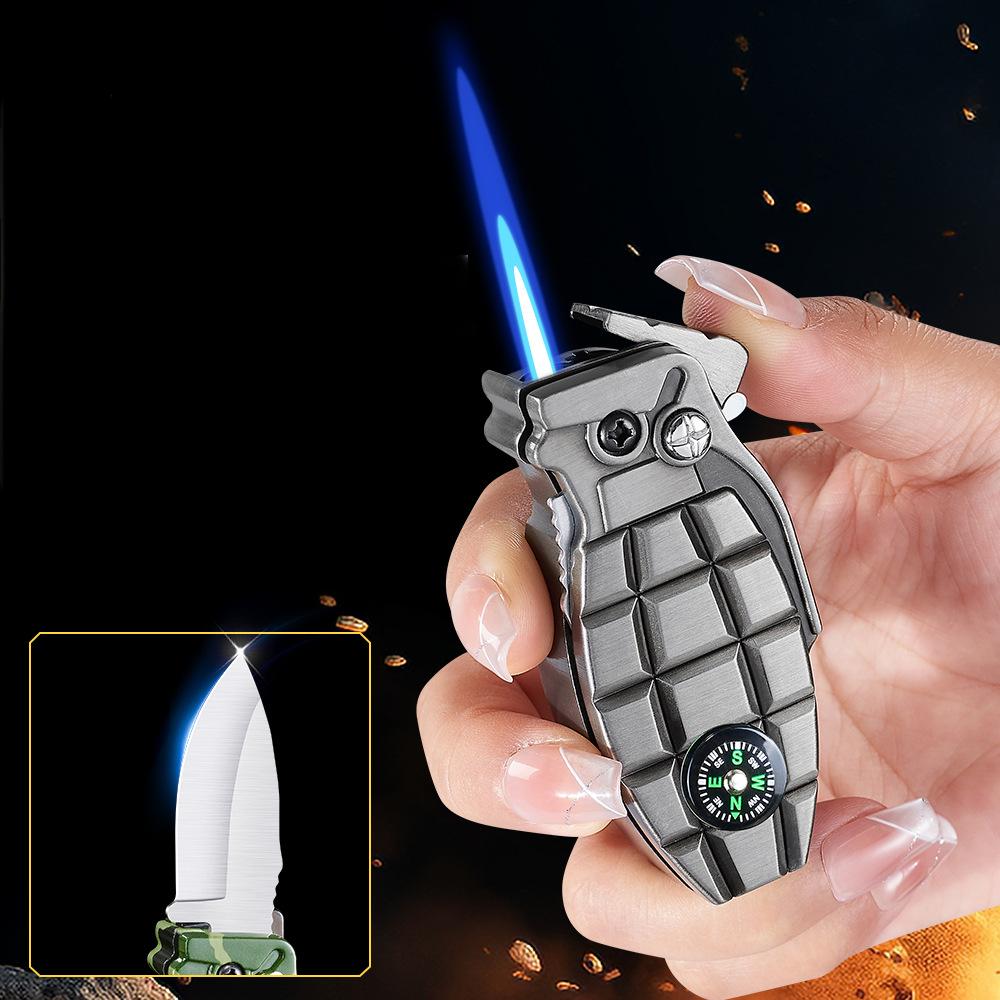 3-in-1 Tactical Butane Torch Lighter Grenade Style, Compass, Foldable Knife, Safety Lock, Metal Construction